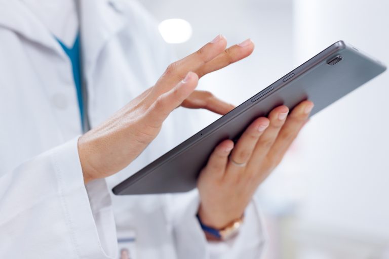Scroll, tablet and hands of doctor in hospital for telehealth, medical service and research in clinic. Healthcare, wellness and person on digital tech for online diagnosis, report and patient results.